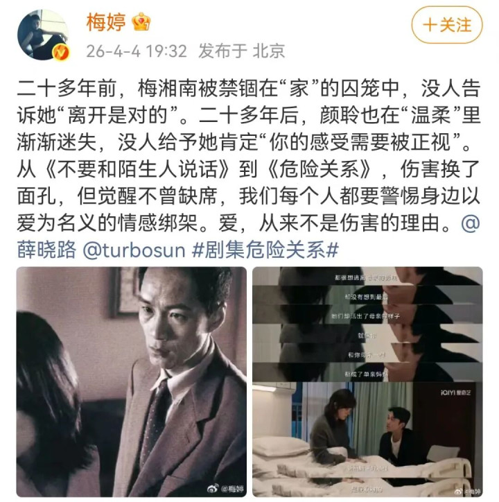 她将我方曾上演的反家暴剧《不要和生疏东谈主言语》中的变装“梅湘南”,与孙俪在新剧《危机干系》里上演的变装“颜聆”进行对比,命令群众警惕以爱为名的情谊打单。